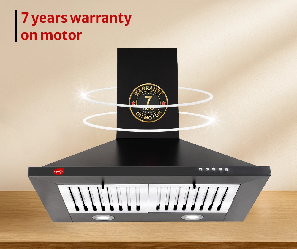 "Wall-mounted kitchen chimney with baffle filter and push-button controls. Offers efficient smoke extraction with a sleek black finish."