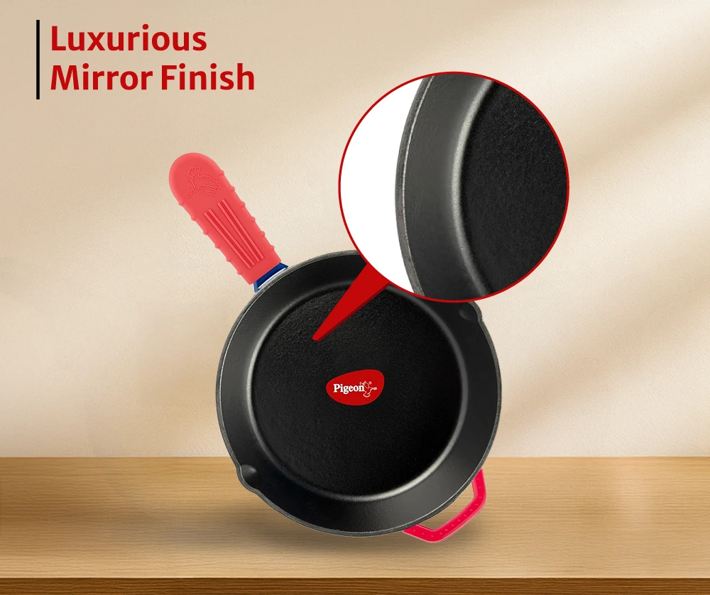 "Solid cast iron fry pan with naturally seasoned surface. Retains heat efficiently for uniform cooking."