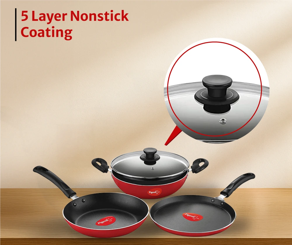 Package Contents: 1 - Fry Pan, 1 - Flat Tawa, 1 - Kadai with Glass Lid | Warranty Information: 1 Year