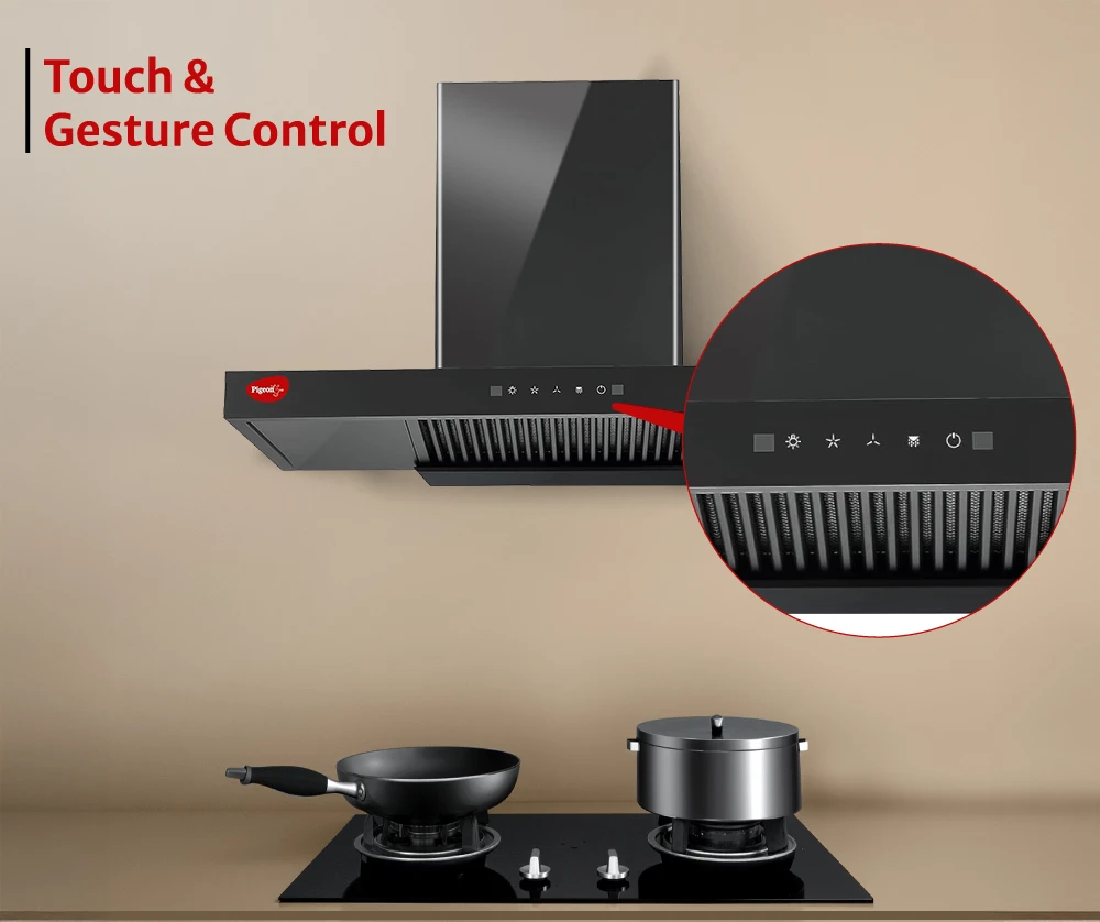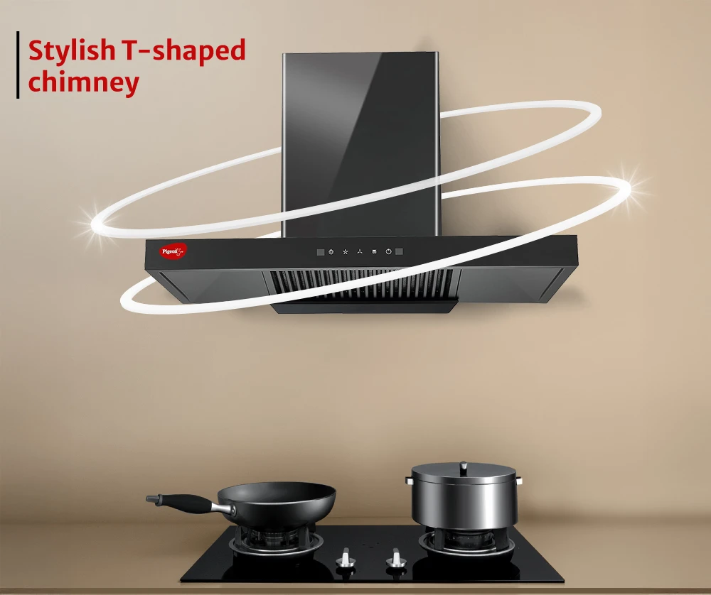"T-shape filterless kitchen chimney with modern design. Ensures powerful suction and low-maintenance operation for daily cooking."
