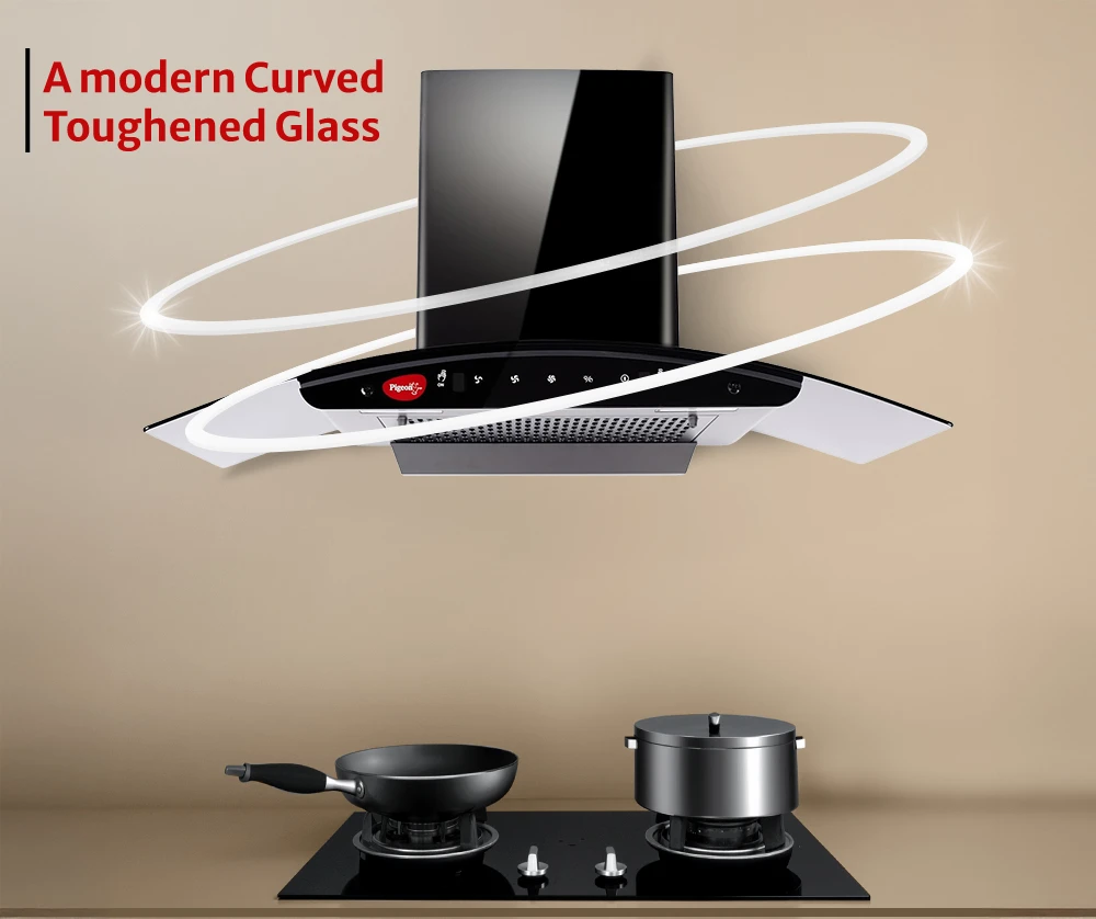 A modern Curved Toughened Glass and sleek design adds an aesthetic appeal to your kitchen space. Wall Mounted with the size of 90 cm | Color: Black
