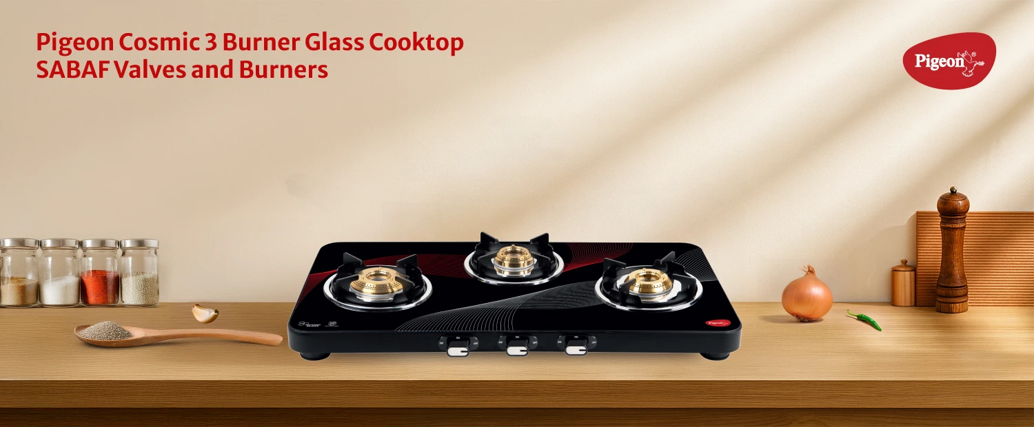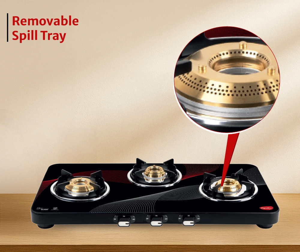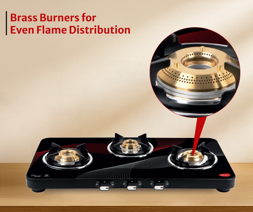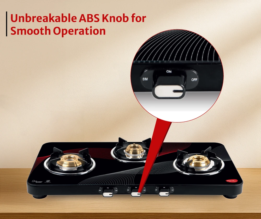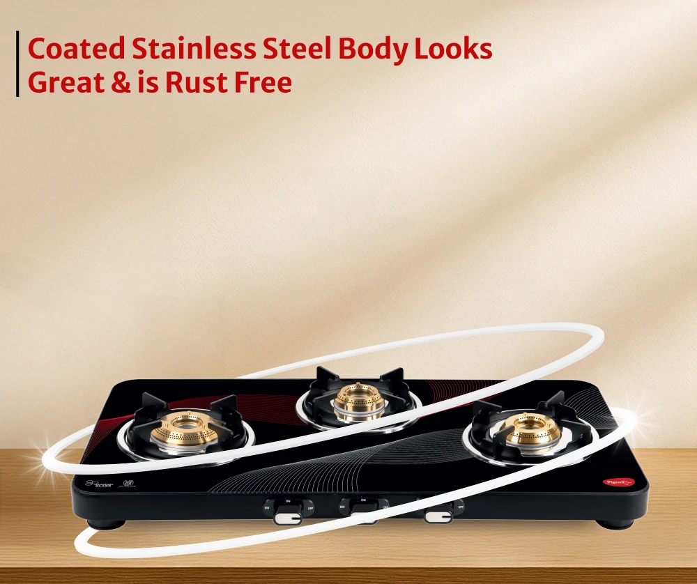 "Stylish 3-burner cooktop with sturdy construction. Ensures smooth and consistent cooking."