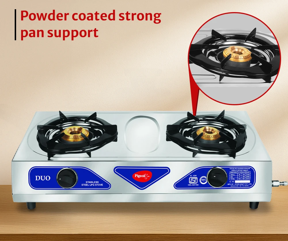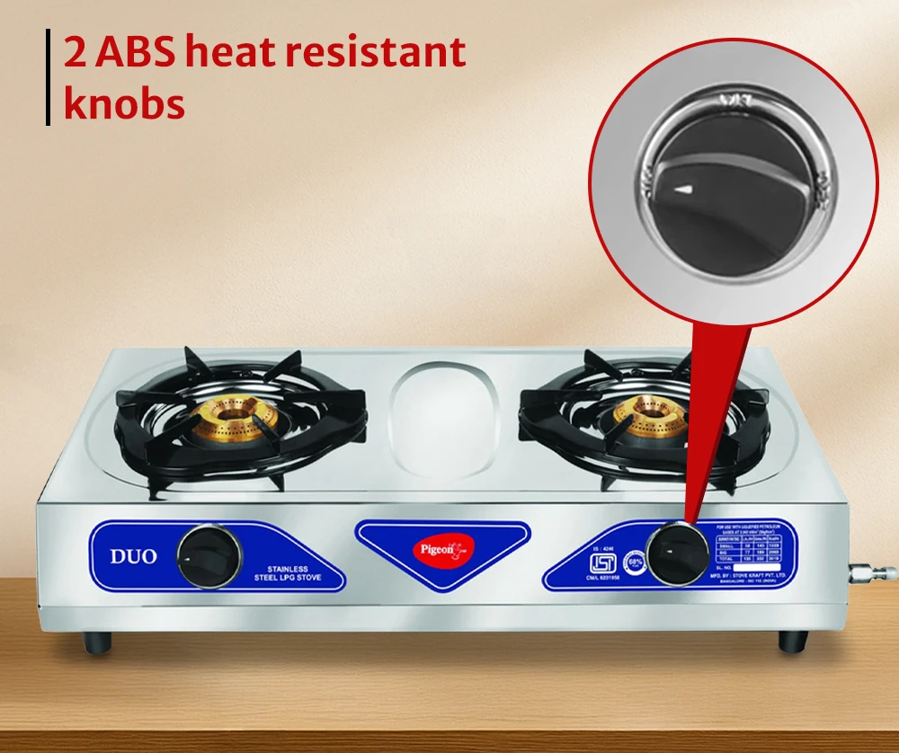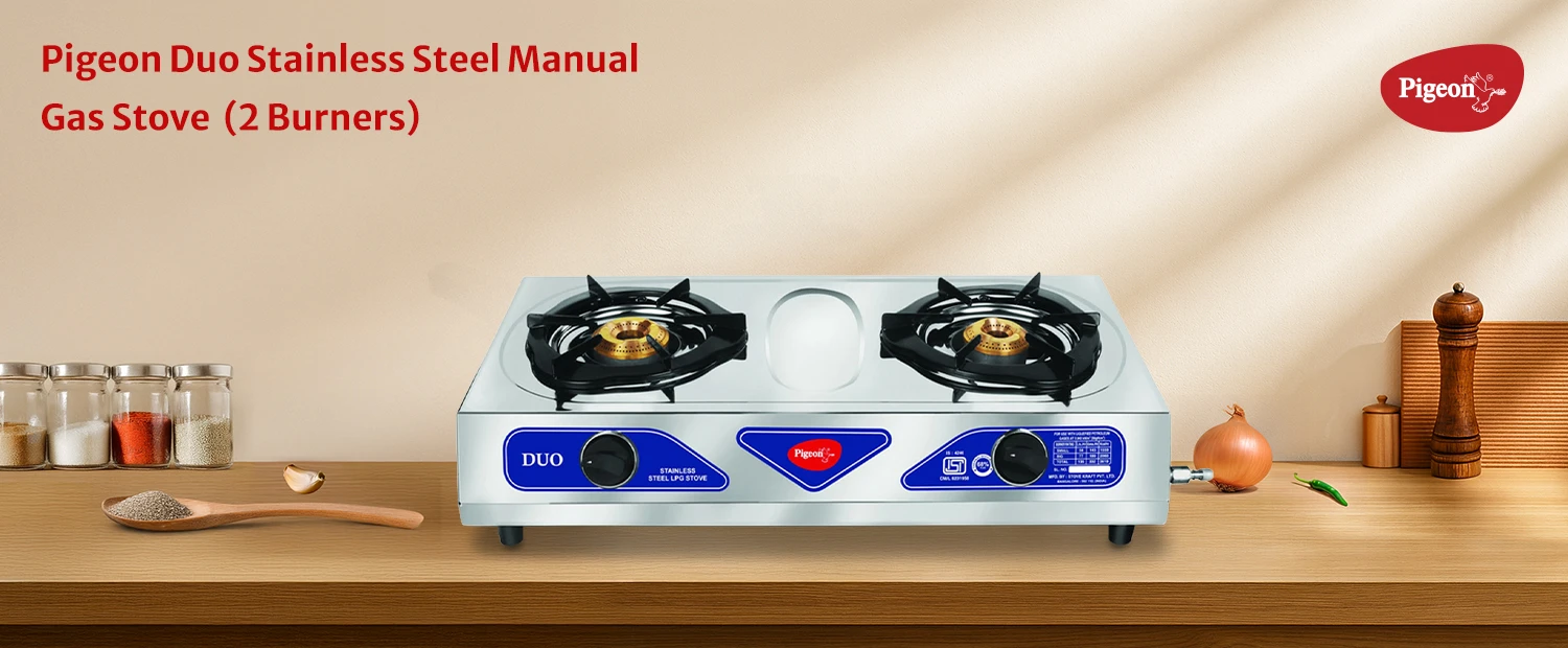 Durable stainless steel gas stove featuring two burners with steady flame output.