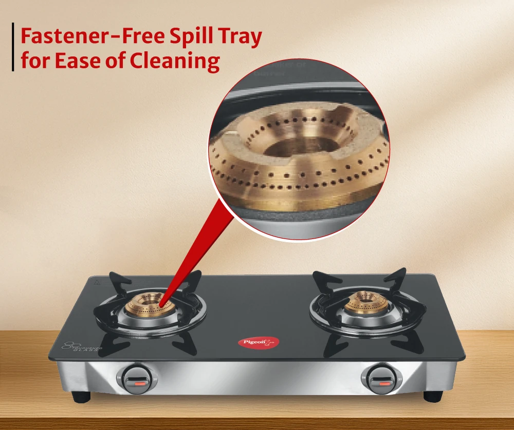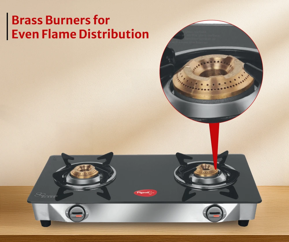 Toughened glass designed to withstand high temperatures ensures durability and safety. Brass burners provide even flame distribution with unique pan supports for better balance.