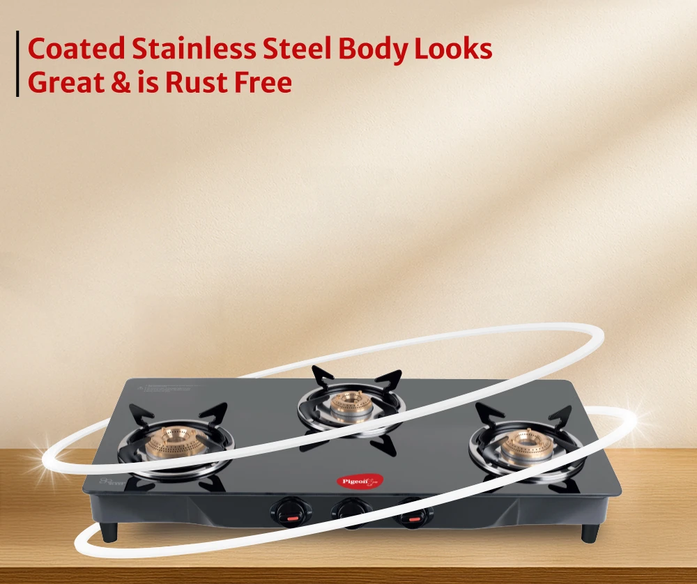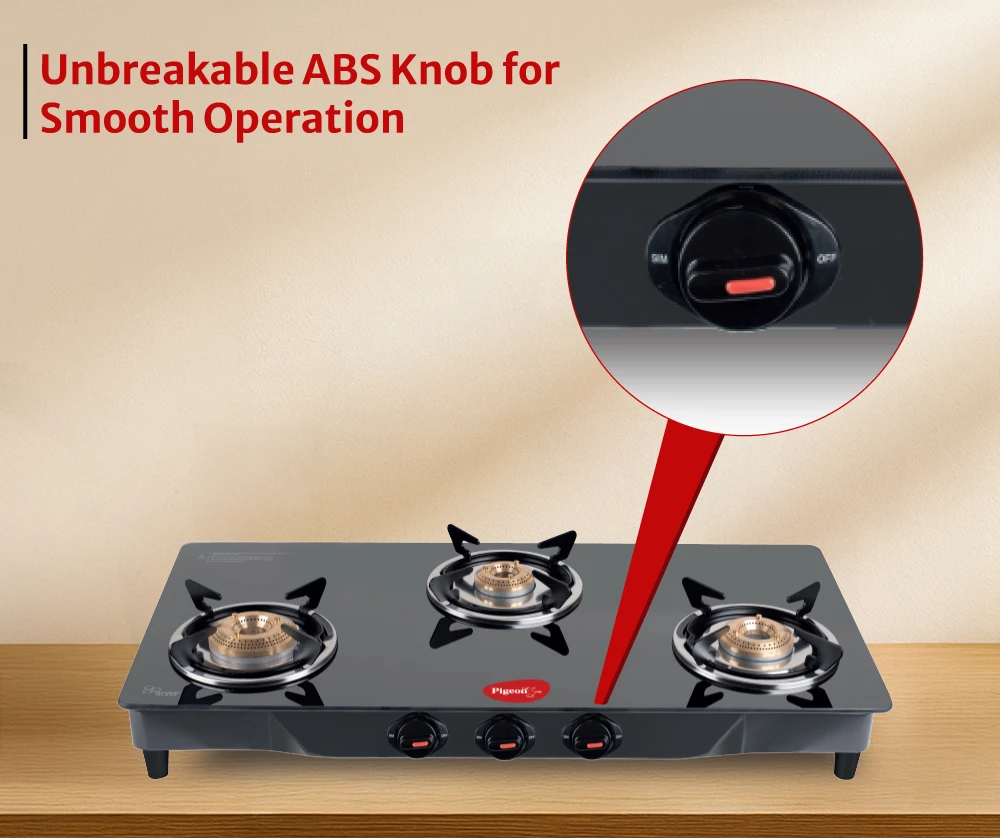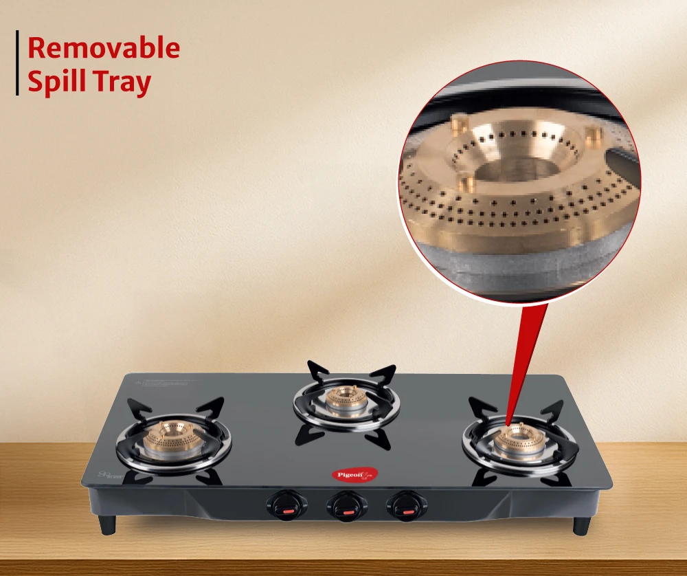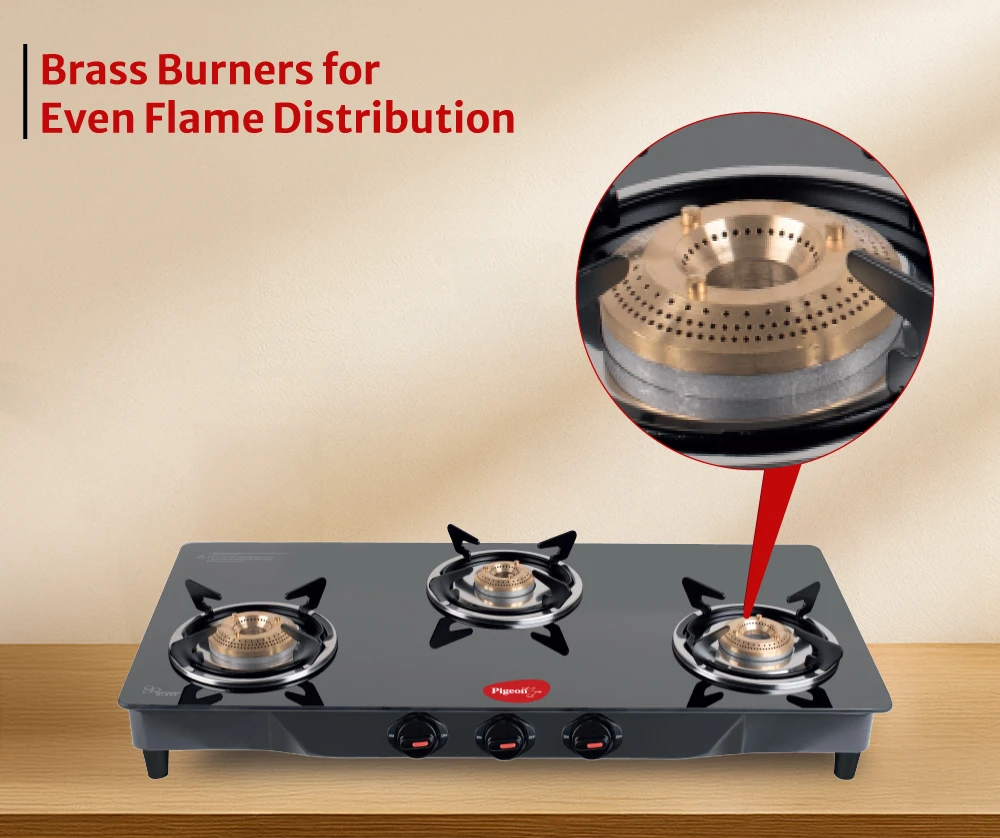 Toughened glass designed to withstand high temperatures ensures durability and safety. Brass burners provide even flame distribution with unique pan supports for better balance.