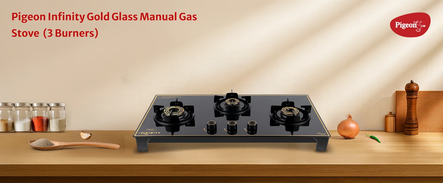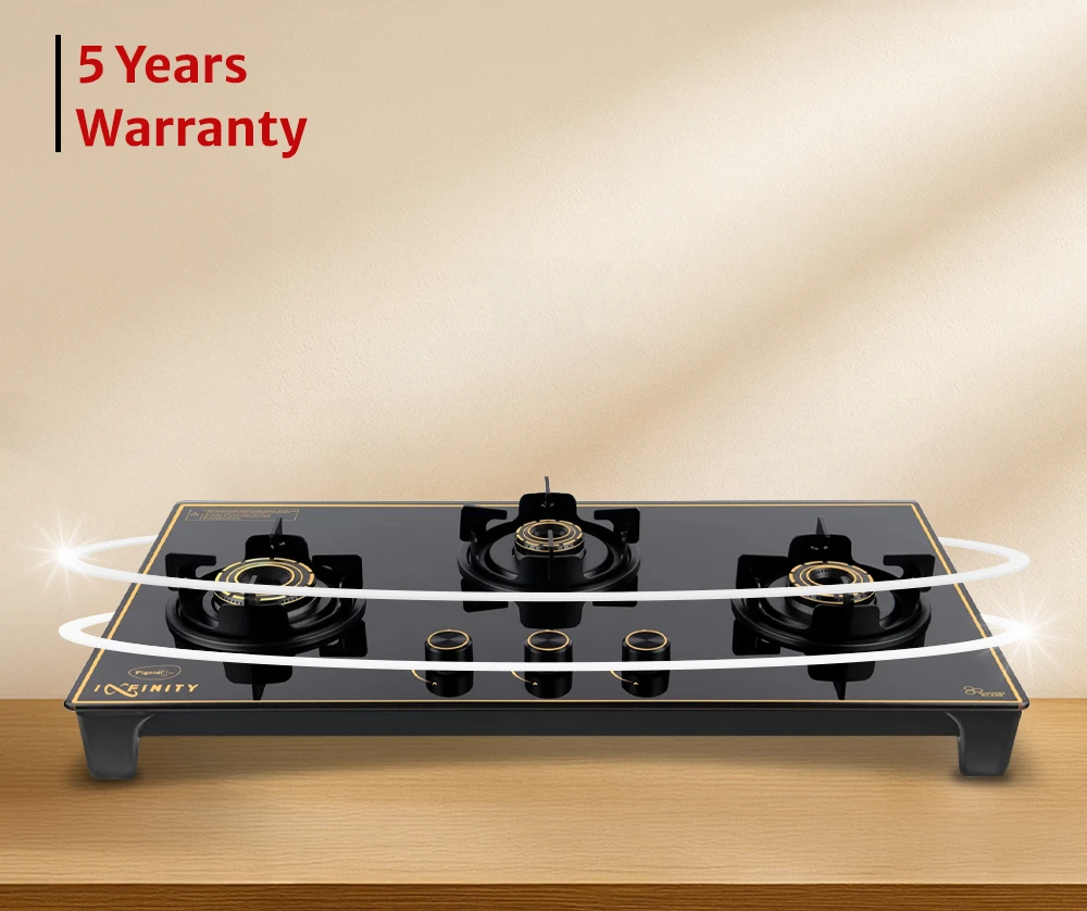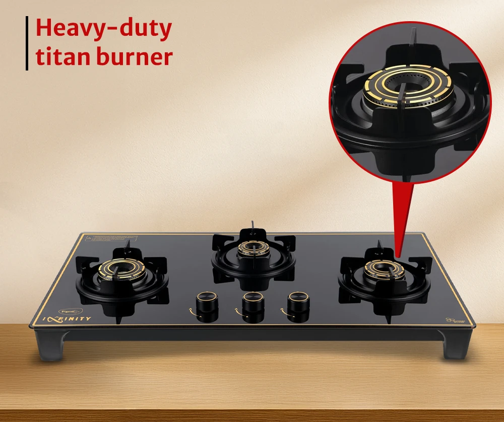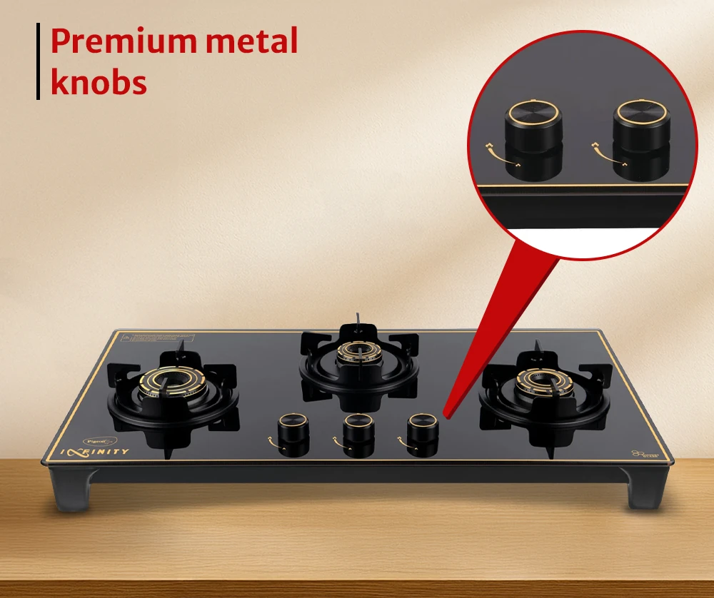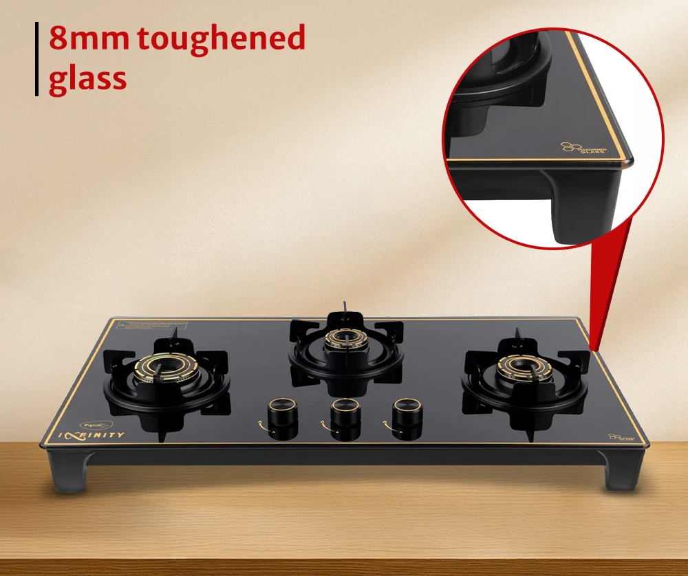Premium glass-top stove featuring three burners for flexible cooking. Strong pan supports and refined gold accents enhance kitchen aesthetics.