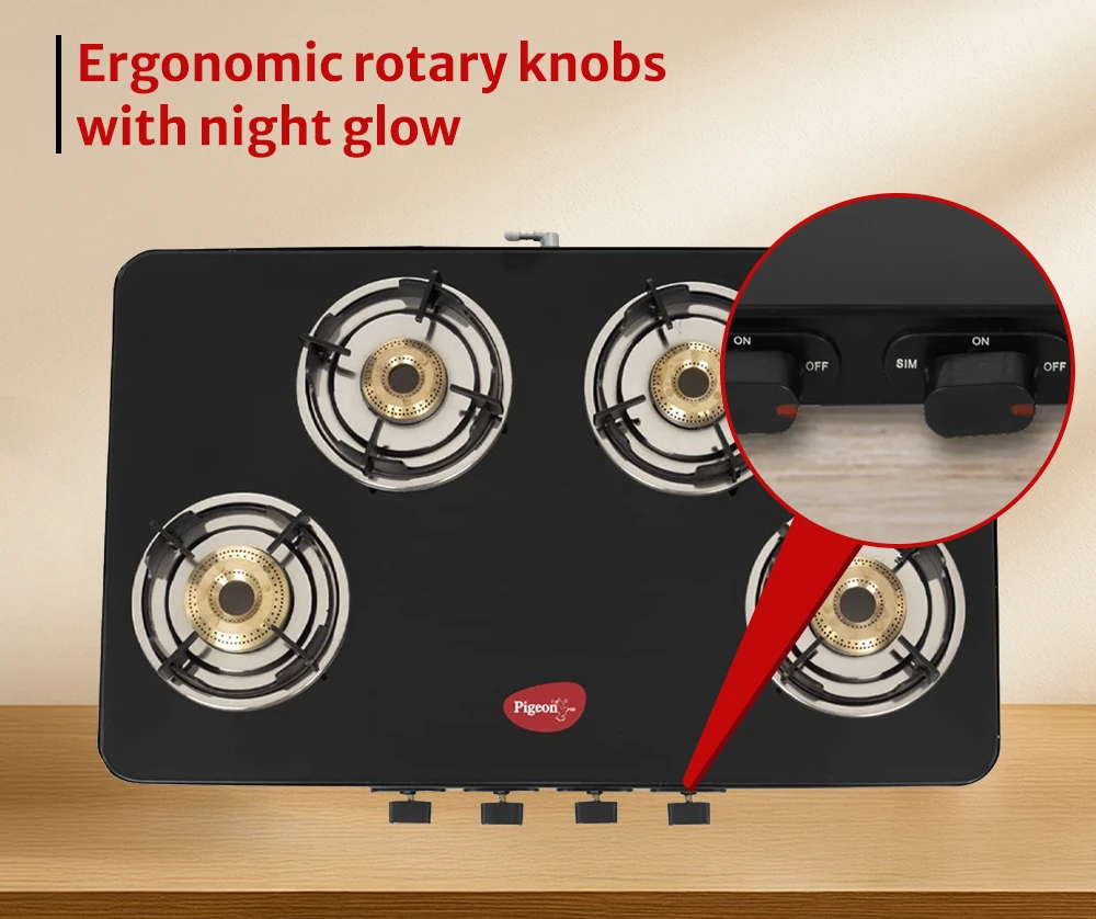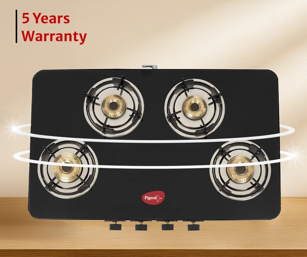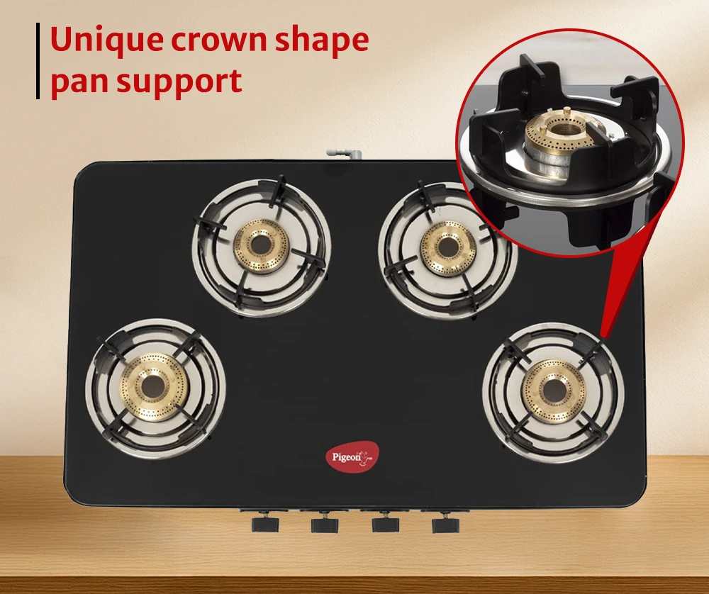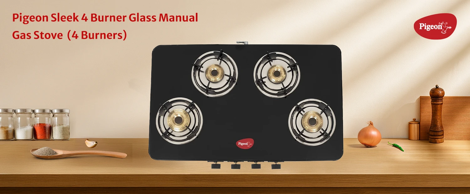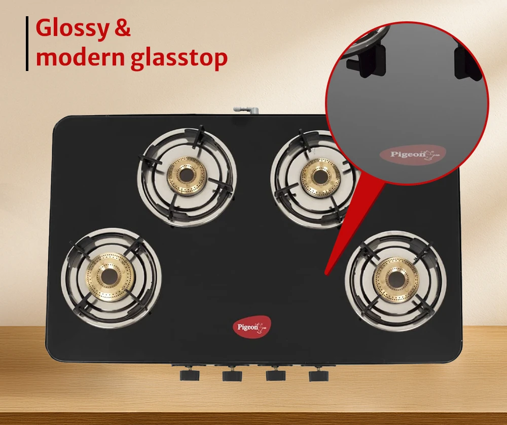 Modern glass-top gas stove with four efficient burners for smooth multitasking. Sturdy build with easy-to-clean surface and stable pan support.