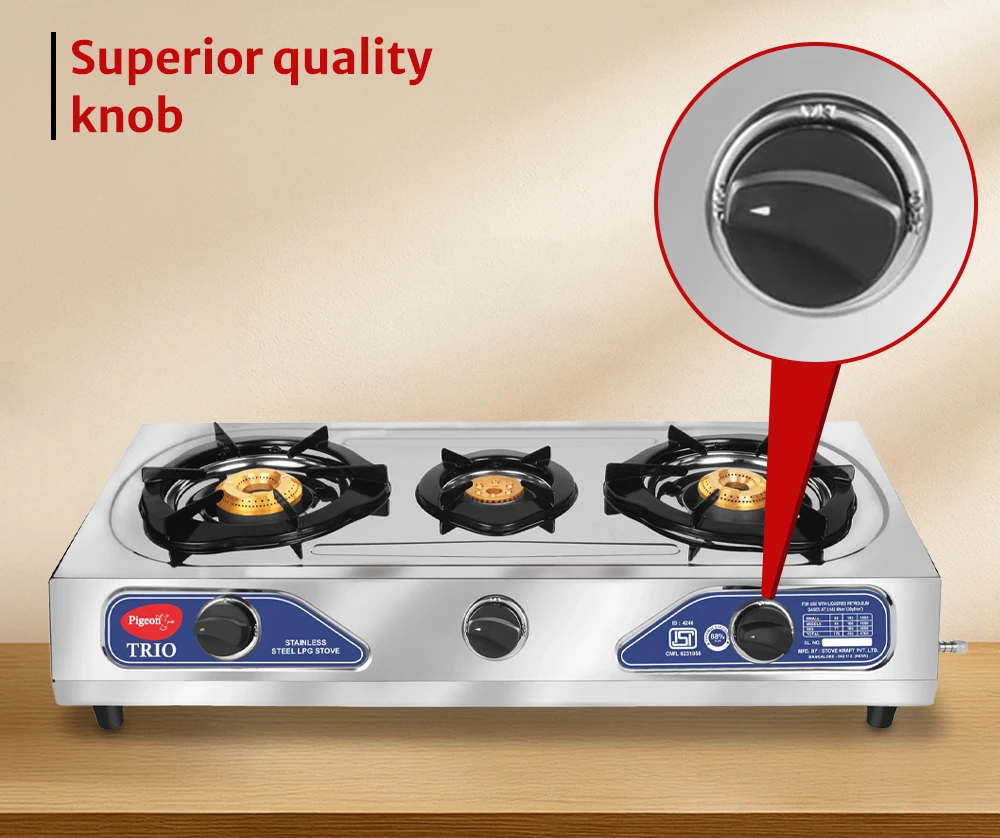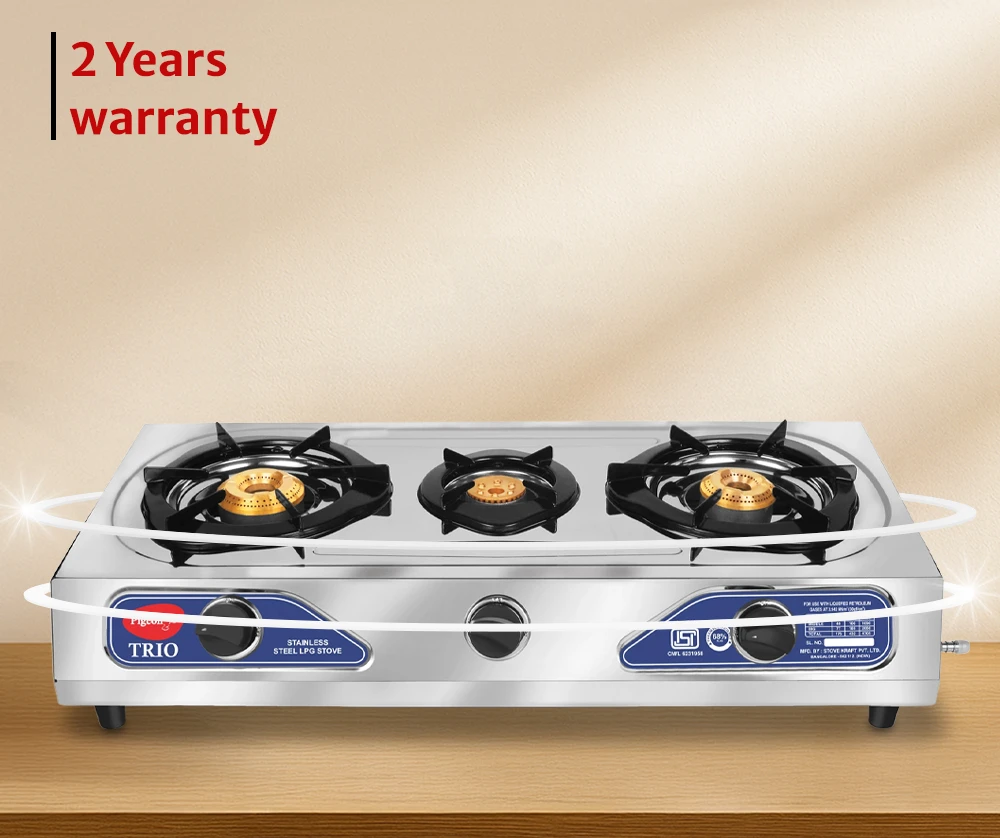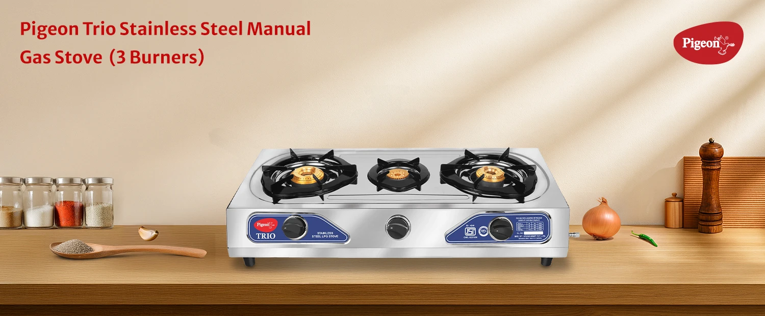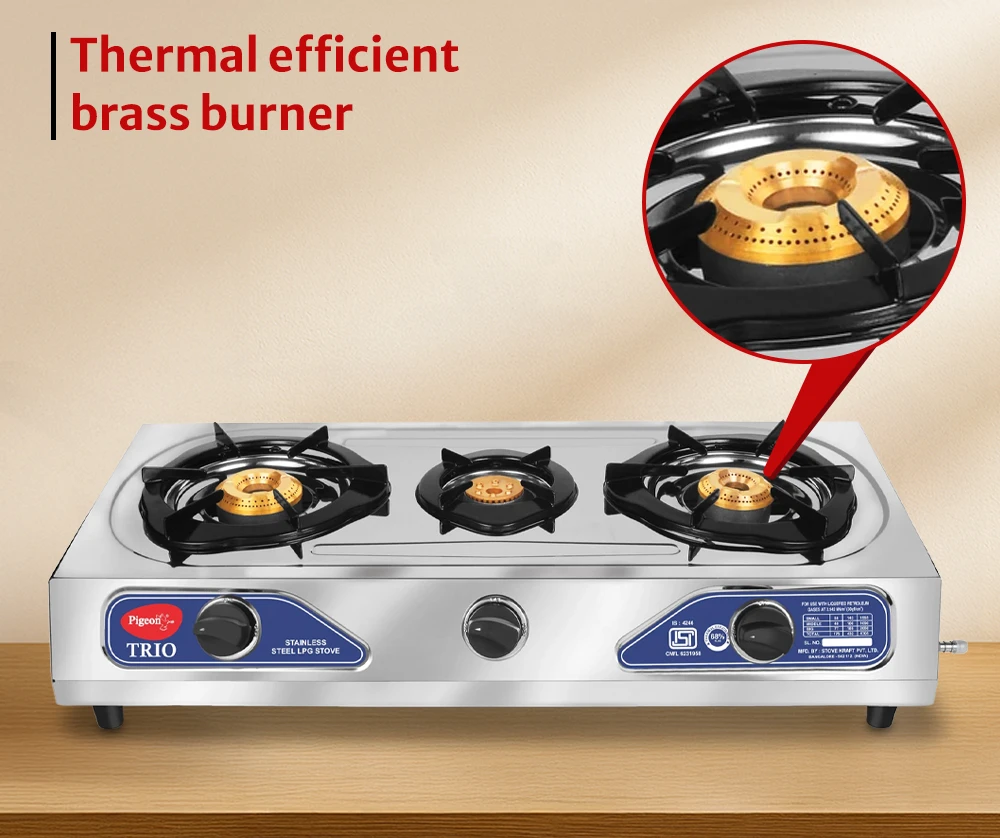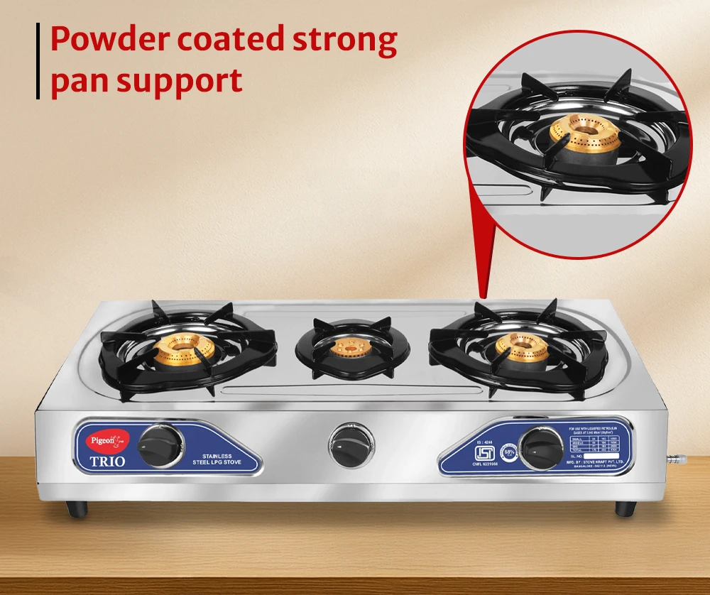 Three-burner stainless steel stove offering practical spacing and dependable performance.