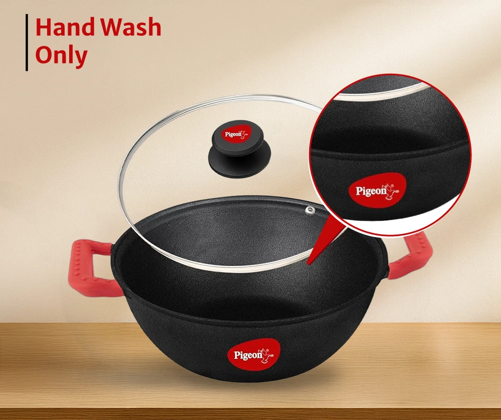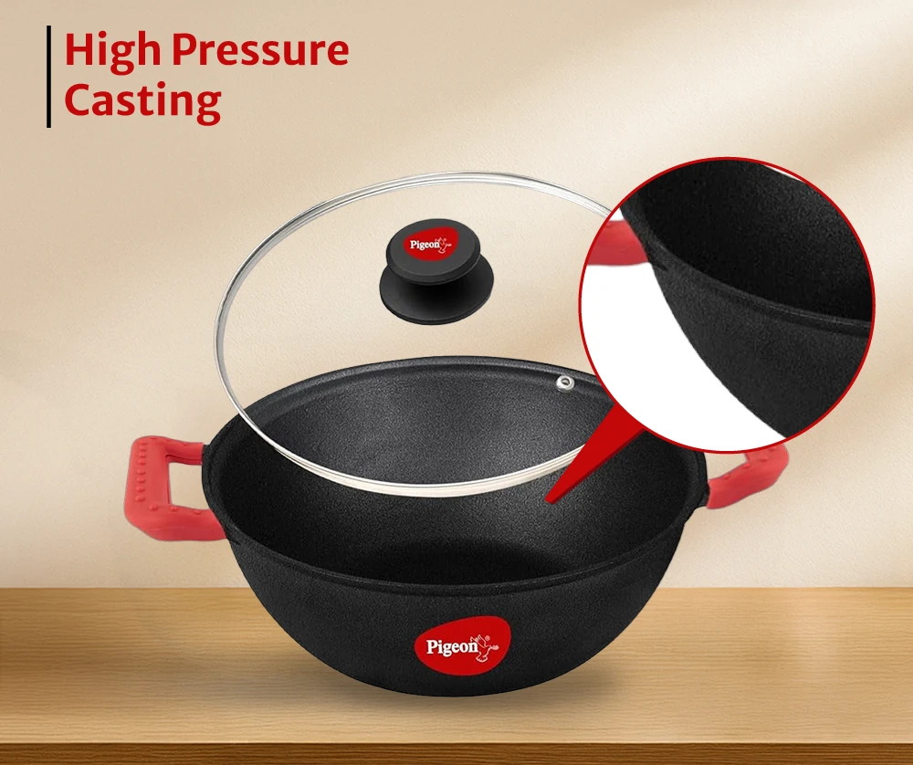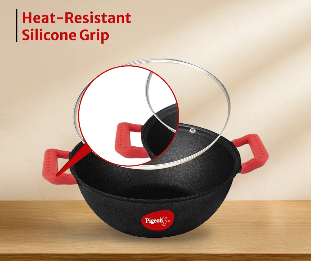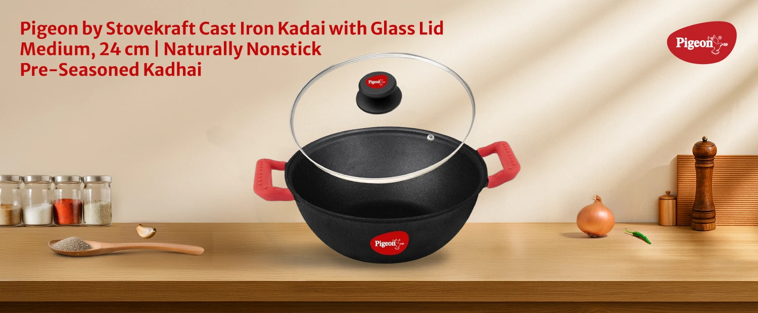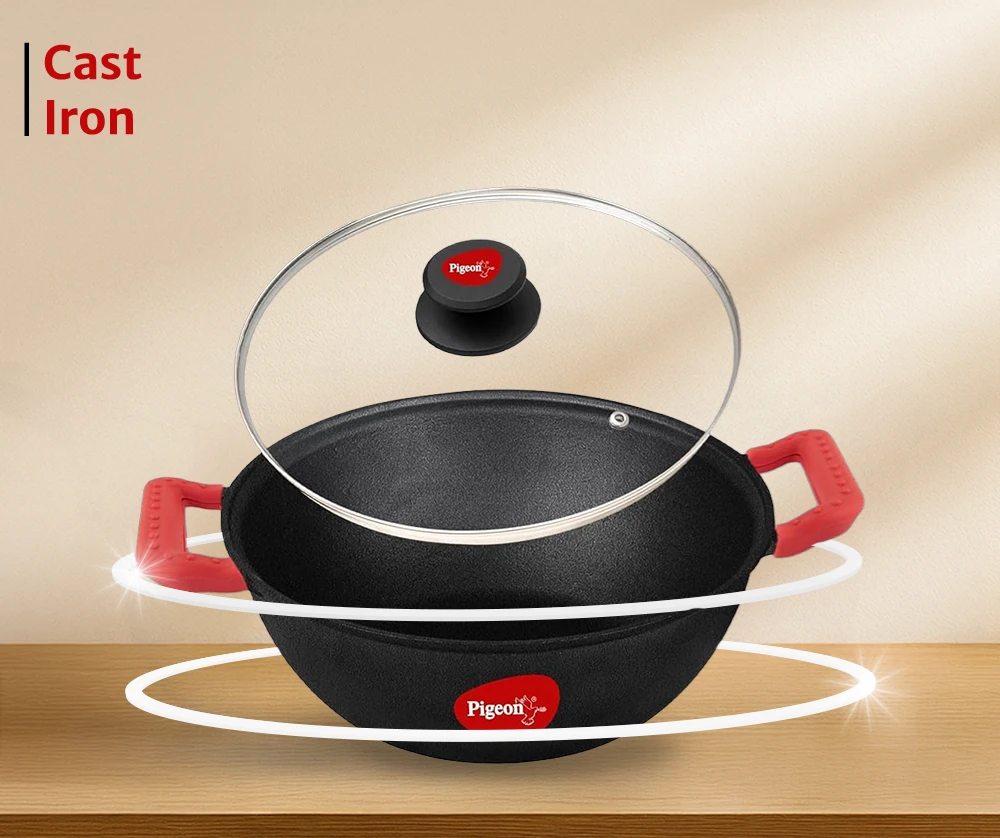 "Sturdy cast iron kadai with tight-fitting lid. Provides steady heat flow and rich cooking performance."