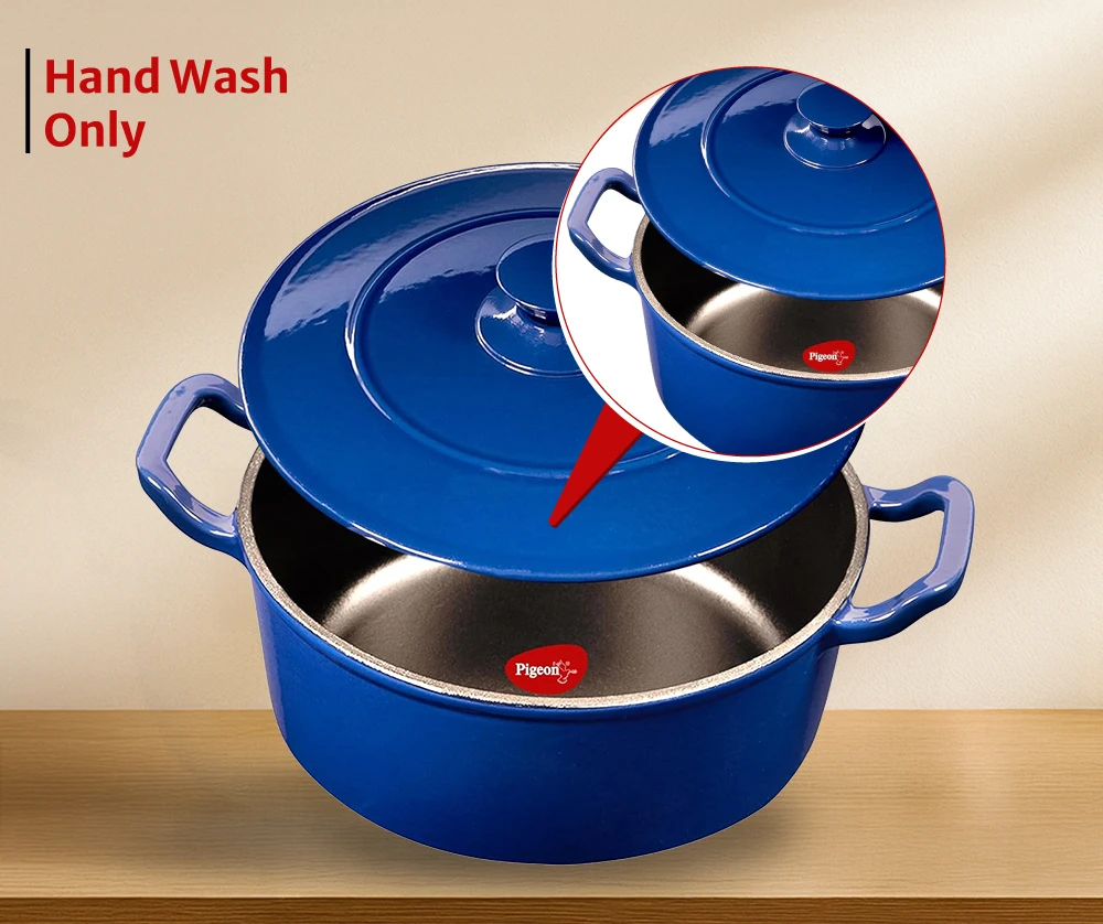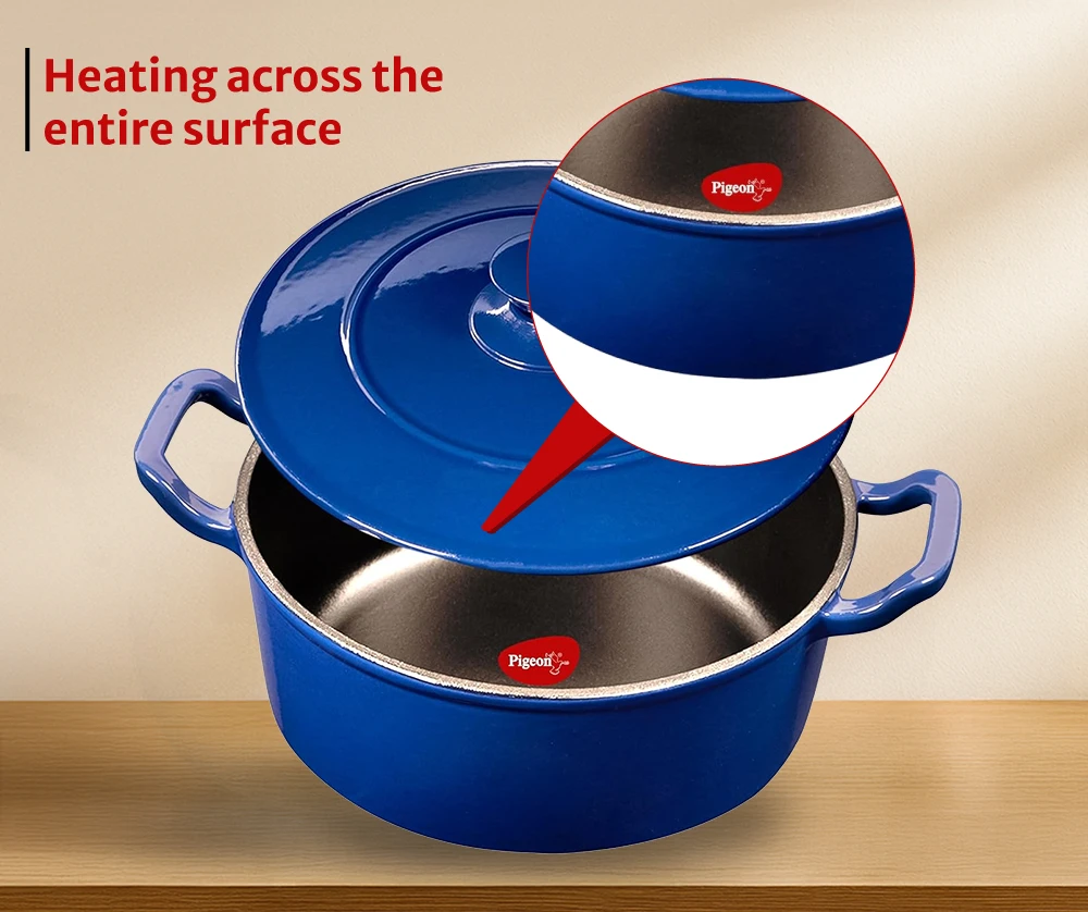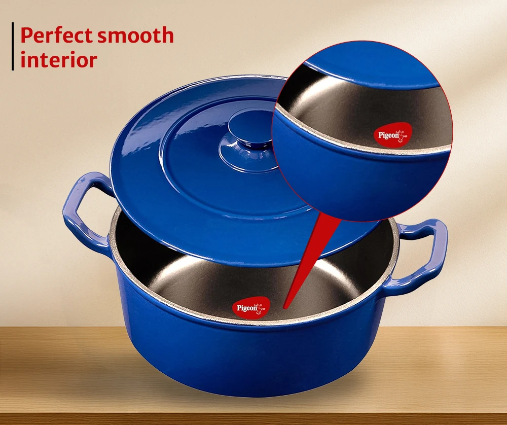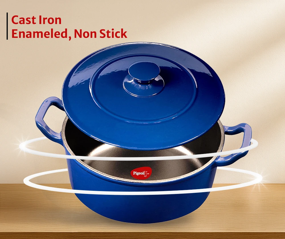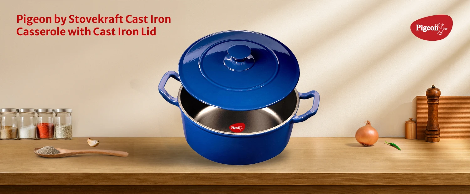 "Premium cast iron casserole with elegant finish and lid. Locks in heat for steady and uniform cooking."