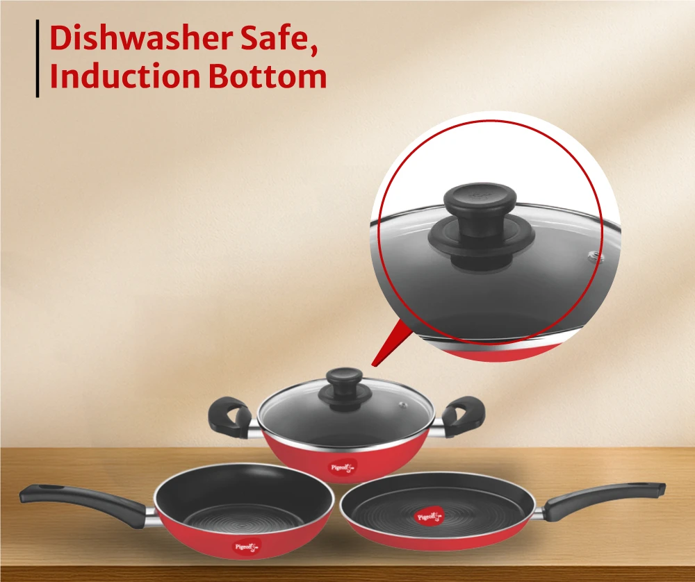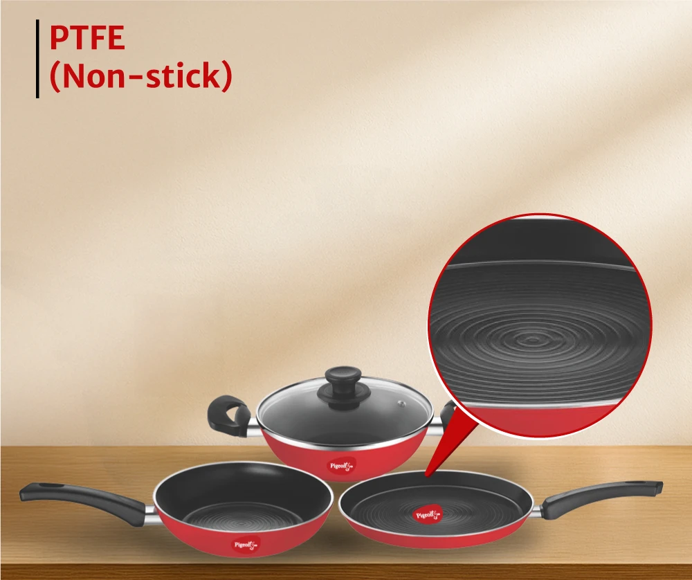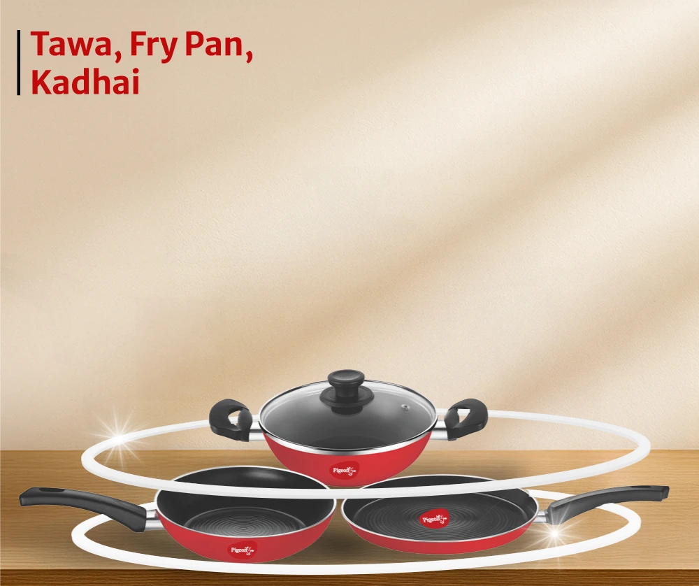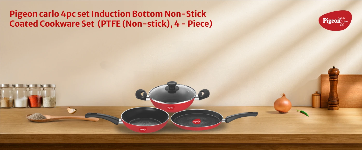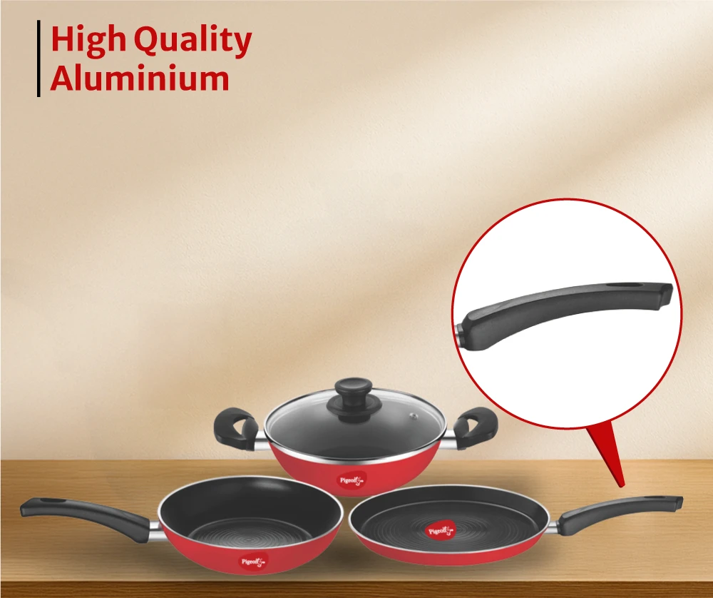 "Premium non-stick cookware set with strong aluminium body. Ensures smooth cooking and long-lasting surface performance."