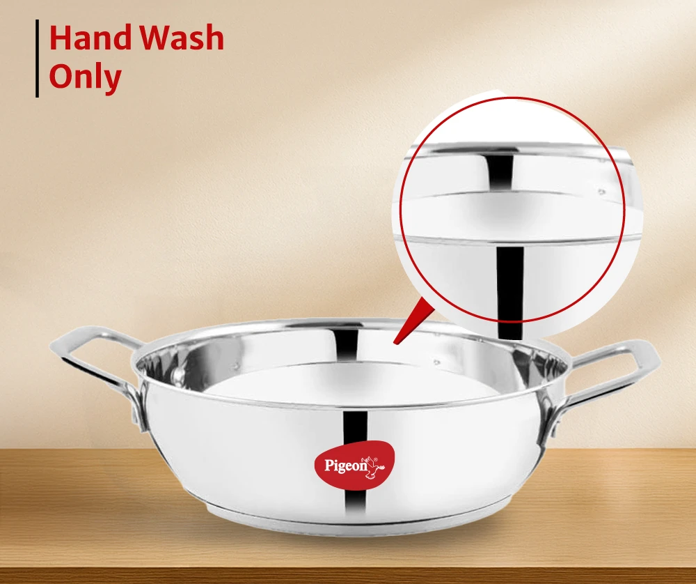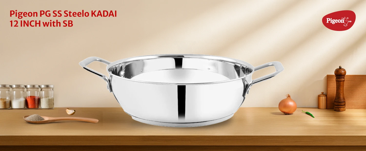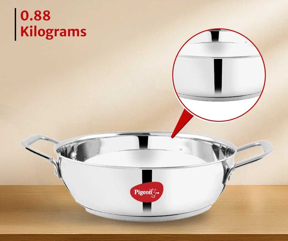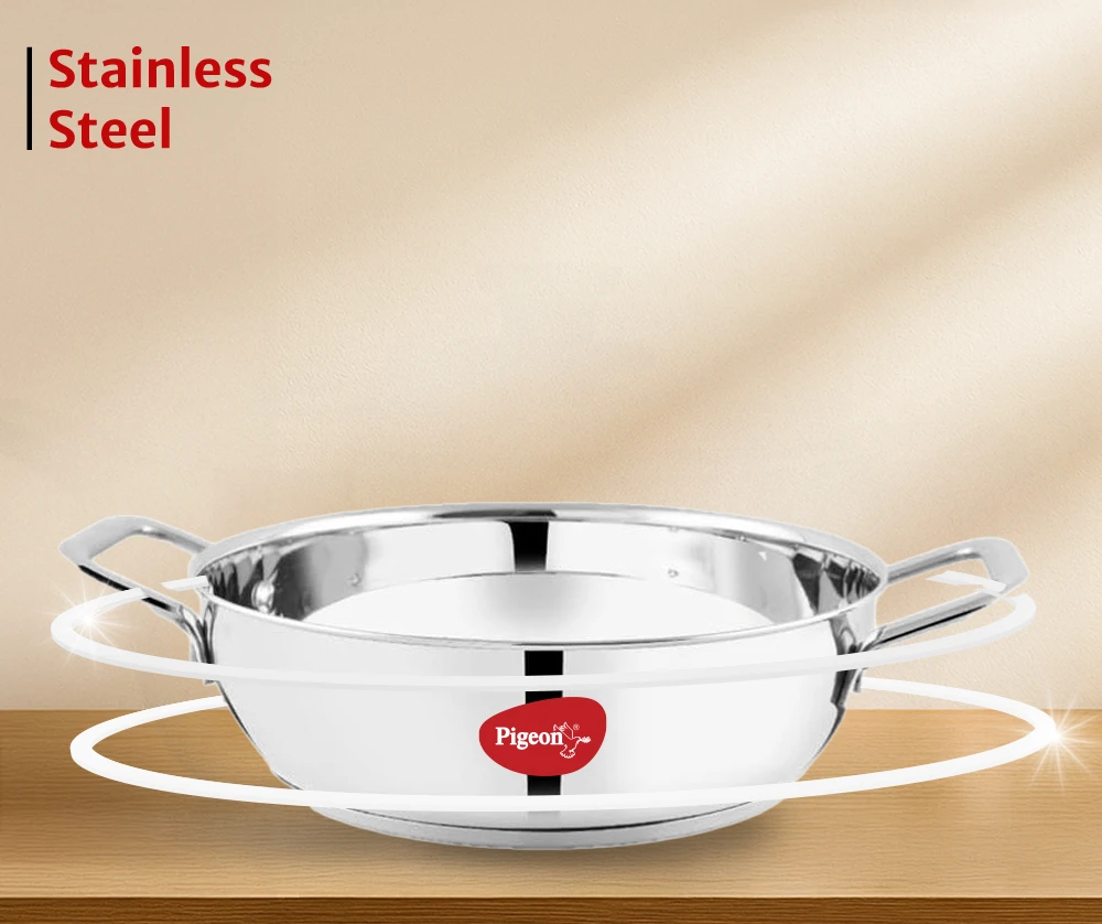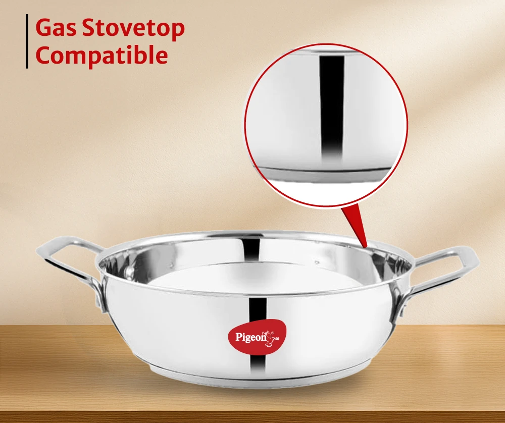 "Stainless steel kadai with sandwich bottom for even heating. Offers durability, heat efficiency, and induction compatibility."