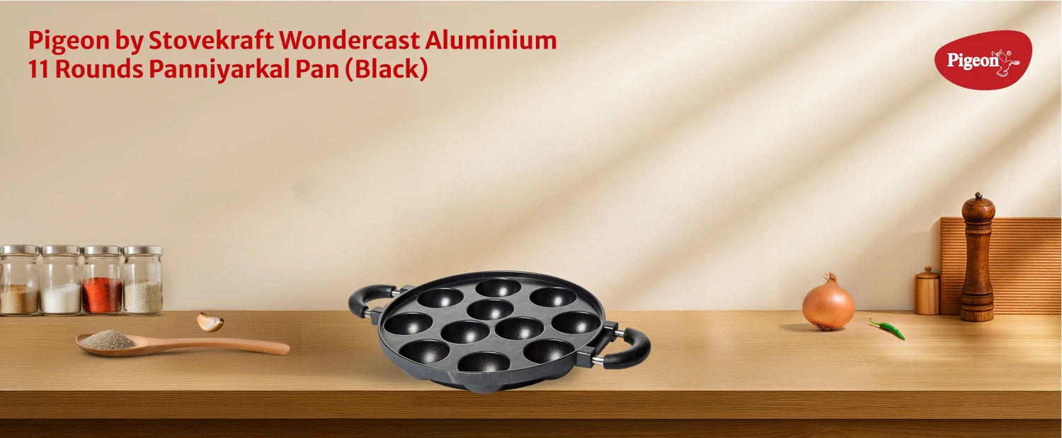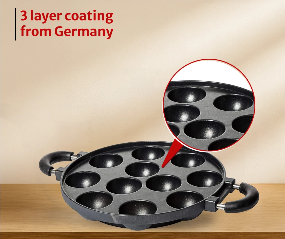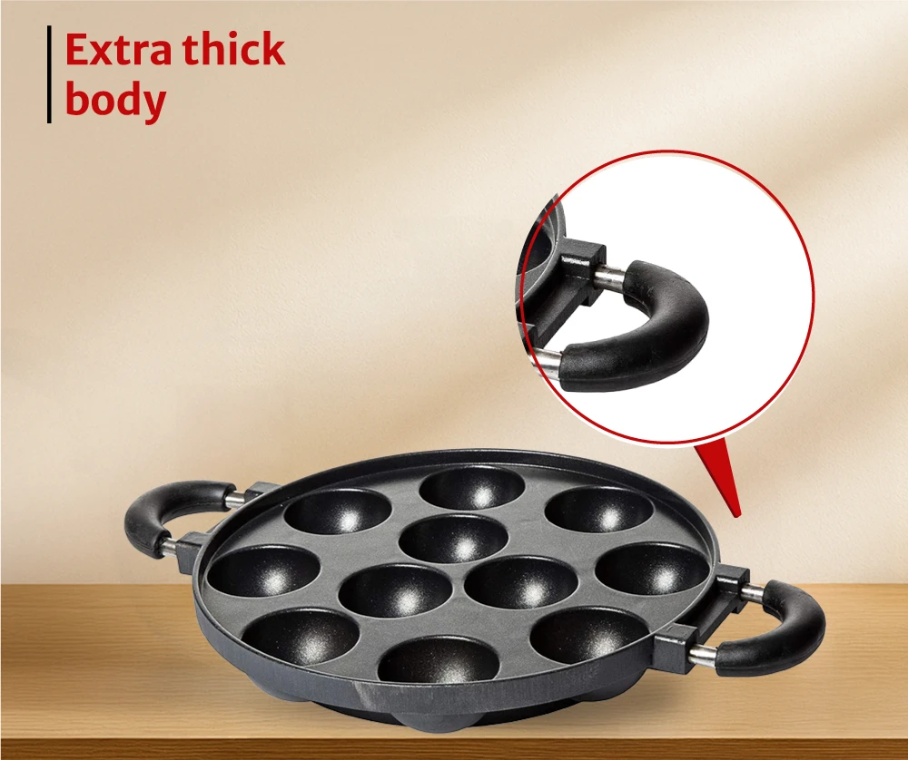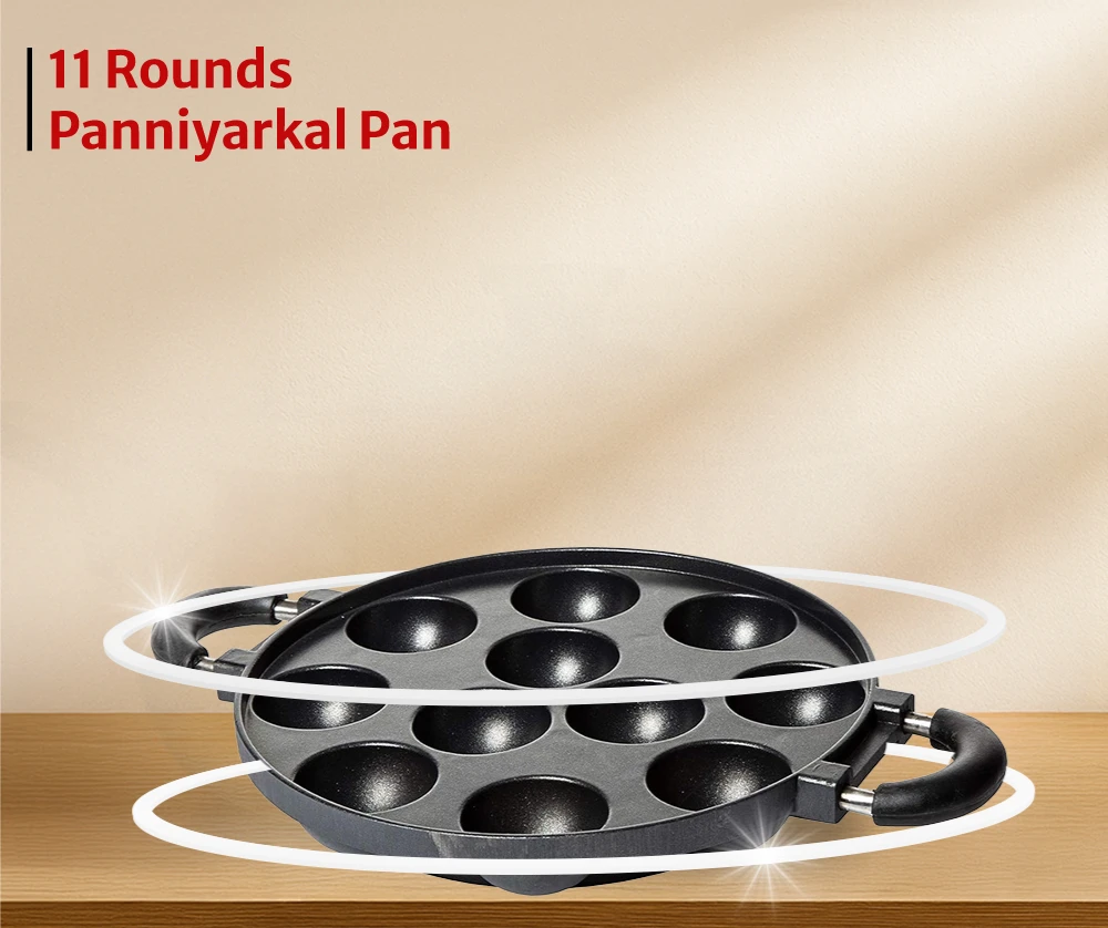 "Cast aluminium paniyarakkal with uniform cavity design. Ensures even heating and easy food release."
