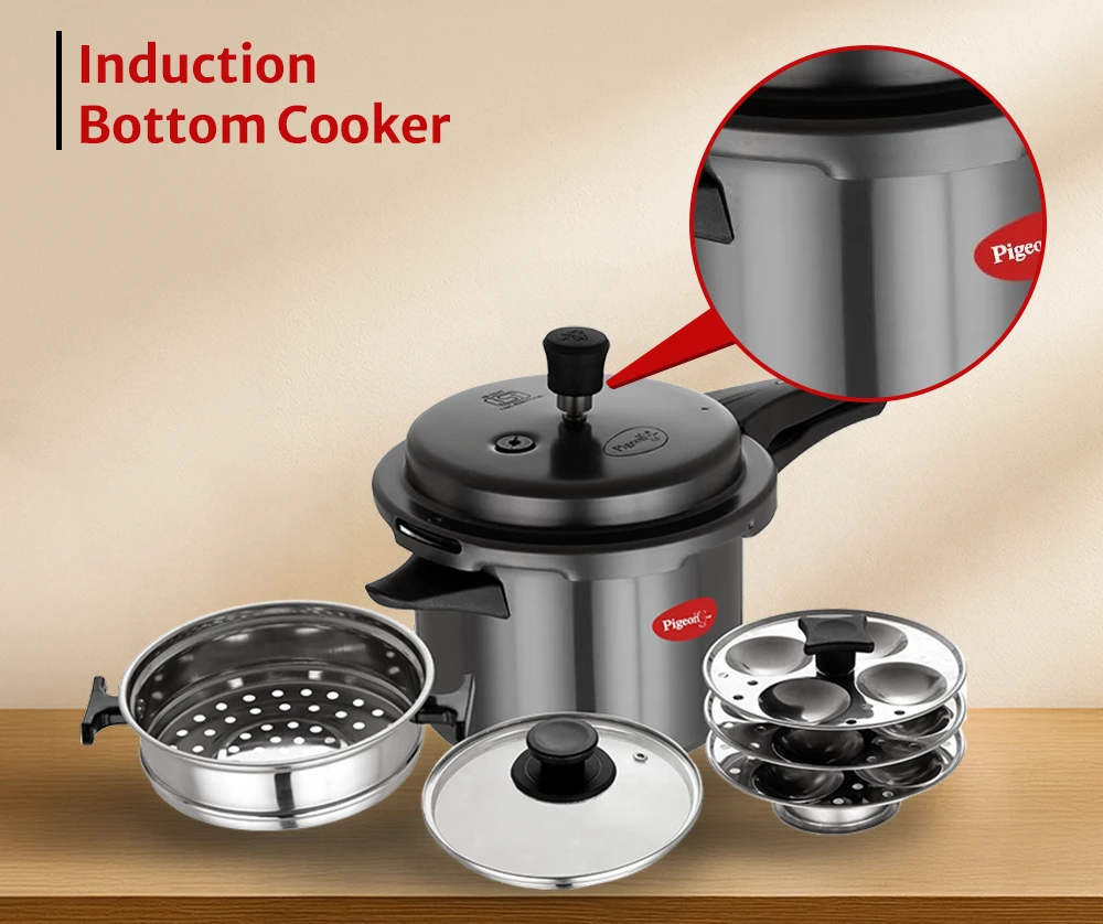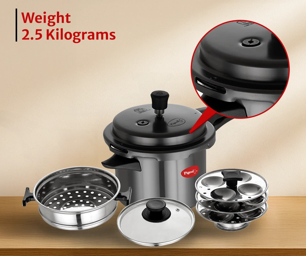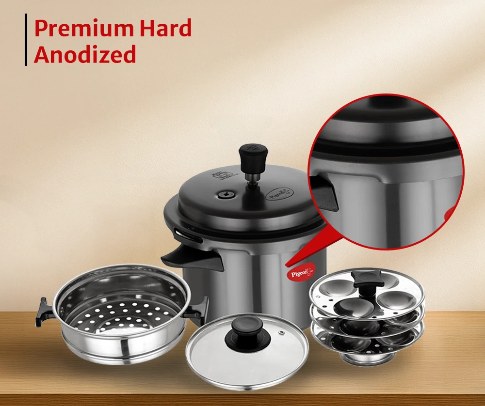A complete 5-in-1 set with cooker, glass lid, steamer, and idly plates. Hard anodised body and induction base for fast, versatile cooking.