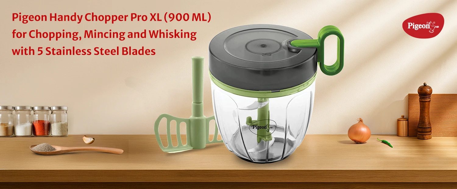 - Pigeon Handy Chopper Pro Extra Large- This speedy manual chopper will help you cut vegetables, fruits and nuts. Makes smart work of tough cutting tasks and hassle free experience which saves up to 50% of your time. As it comes with the whisker which works as egg beater and lassie maker.